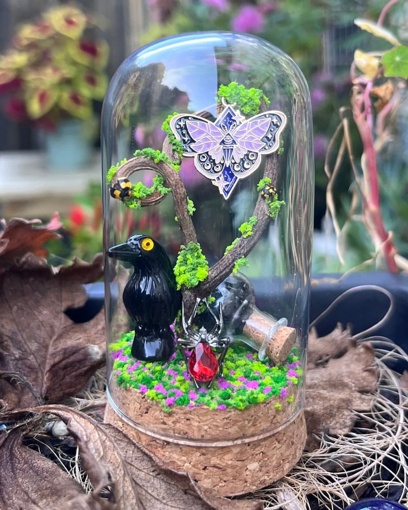 Inside, you’ll find tiny clusters of mushrooms, dried flowers, twisted roots, and witchy trinkets—carefully arranged to feel like a secret spot you might stumble across if you looked closely enough.